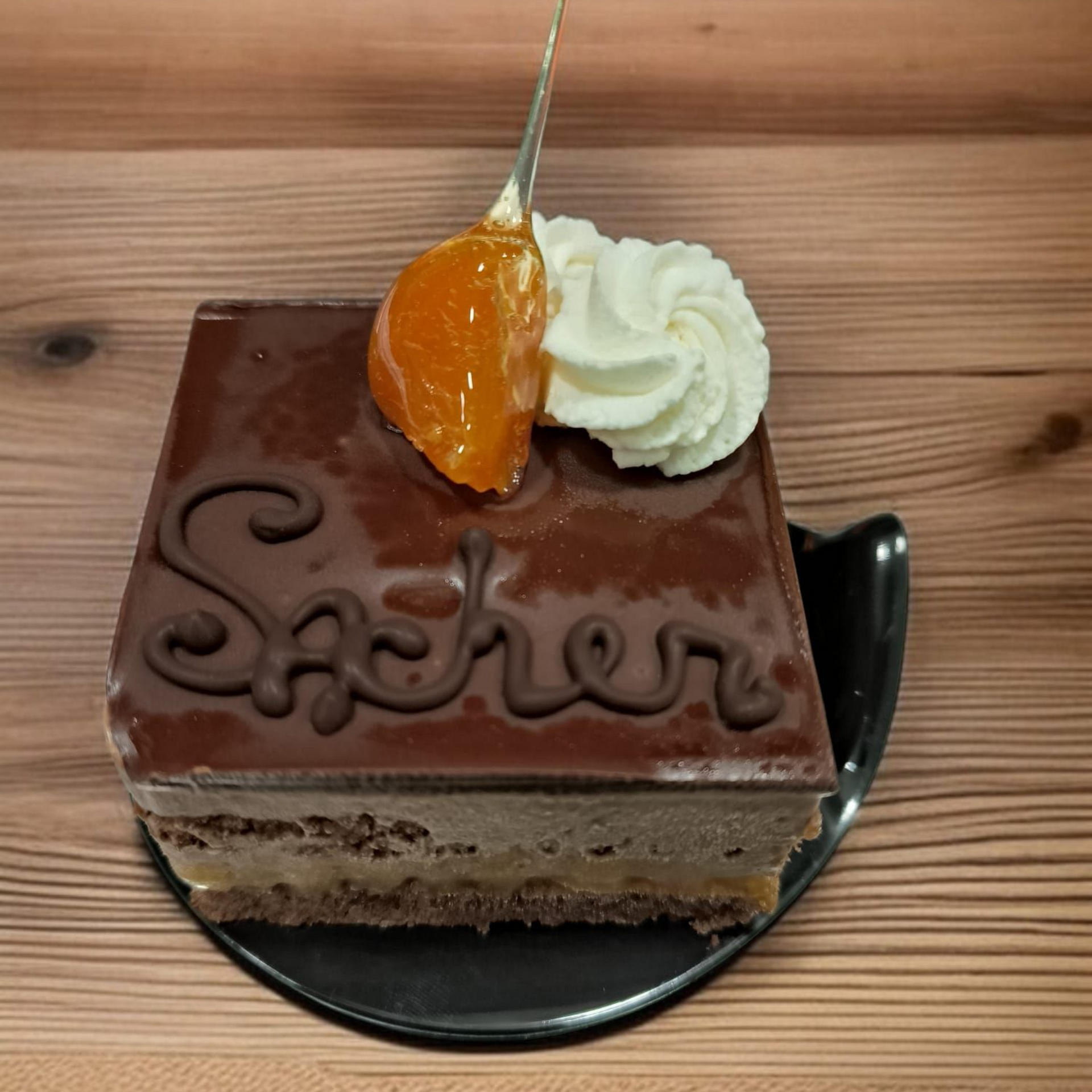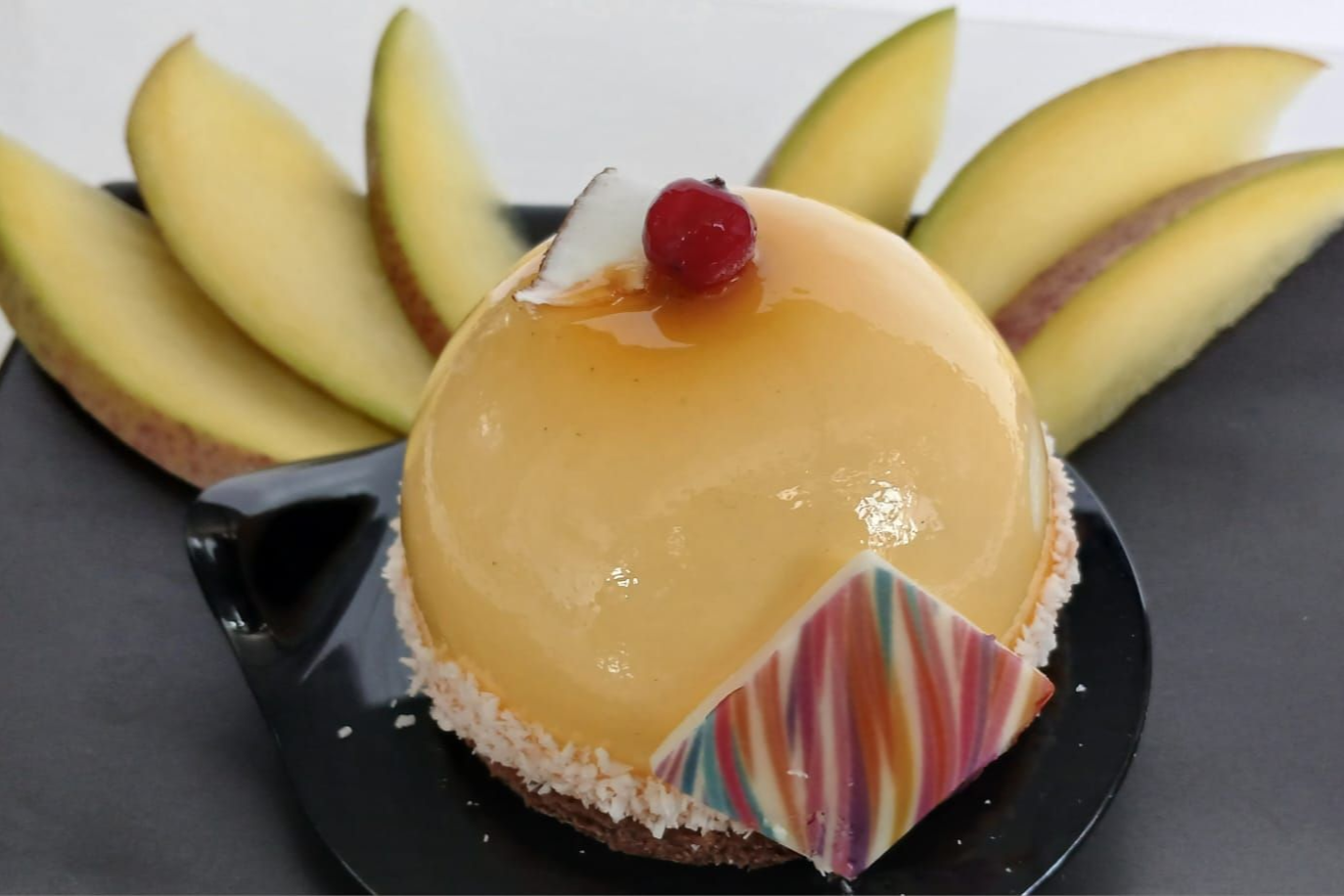 semifreddo al cocco , cuore di gelee' al mango, fondo di pan di Spagna, glassa al mango. (disponibile da aprile a settembre)