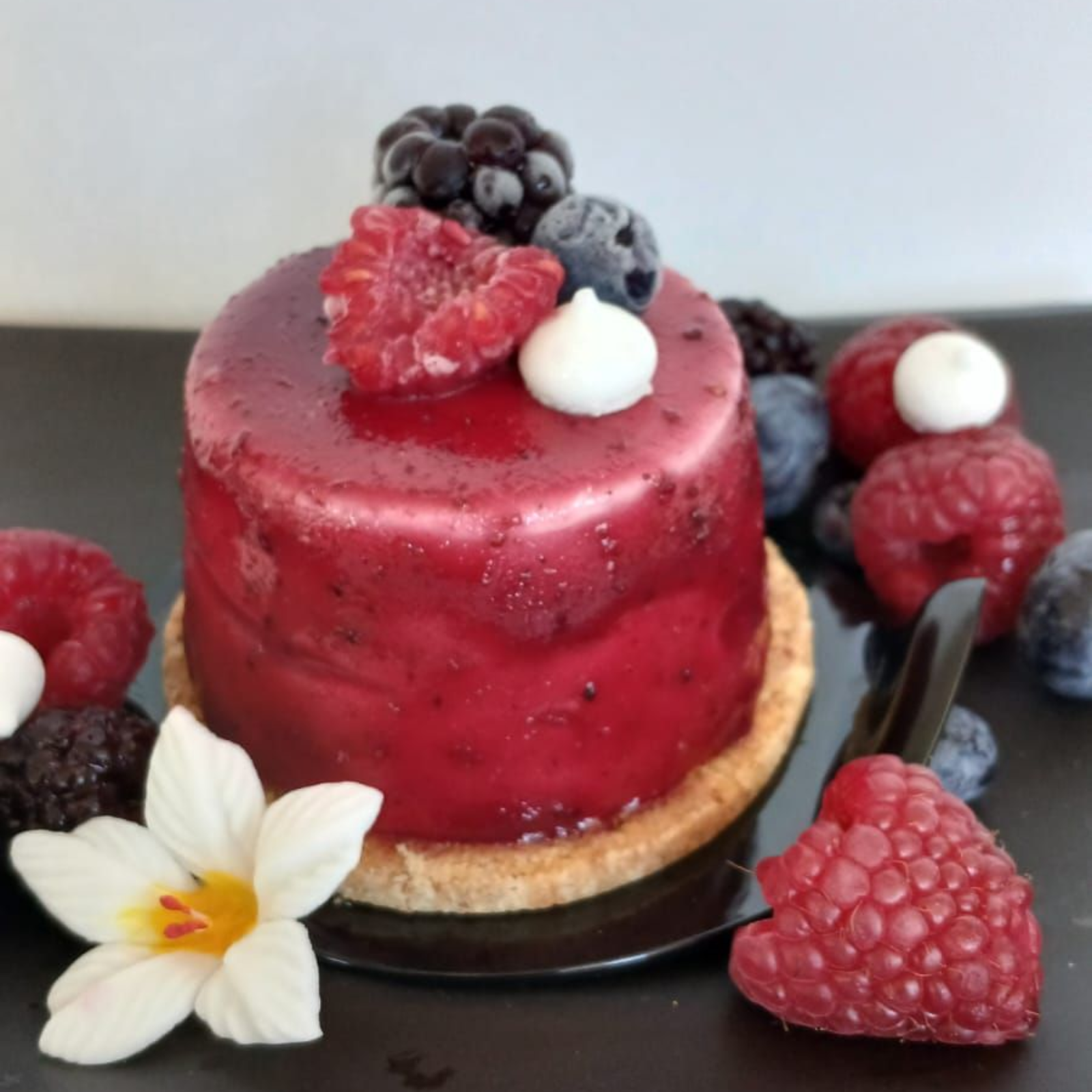 Delicato composto a base di panna, formaggio e tuorlo d’uovo con salsa ai lamponi e tradizionale fondo a base di biscotti, burro e zucchero di canna.