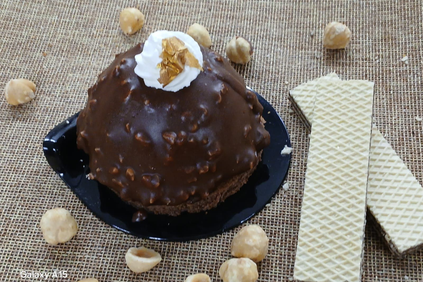 semifreddo alla gianduia e granella di nocciole, fondo di pan di Spagna al cacao con variegato wafer, copertura tipica del rocher